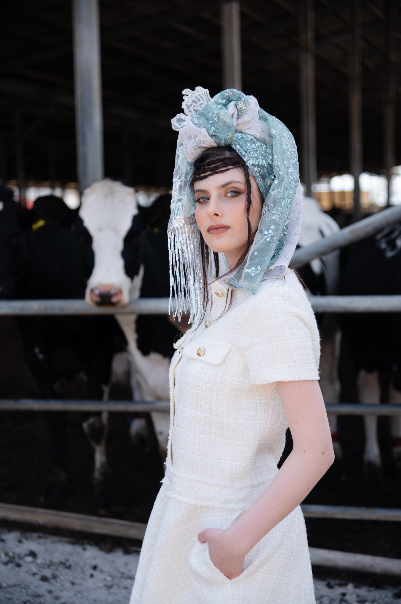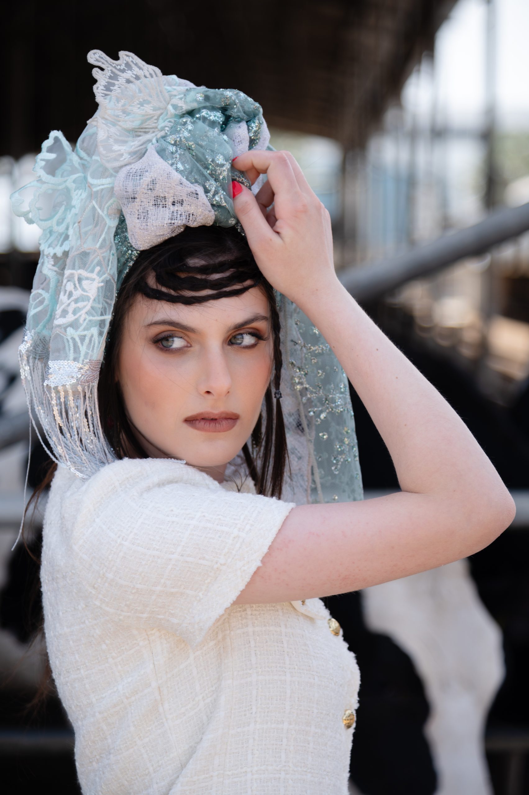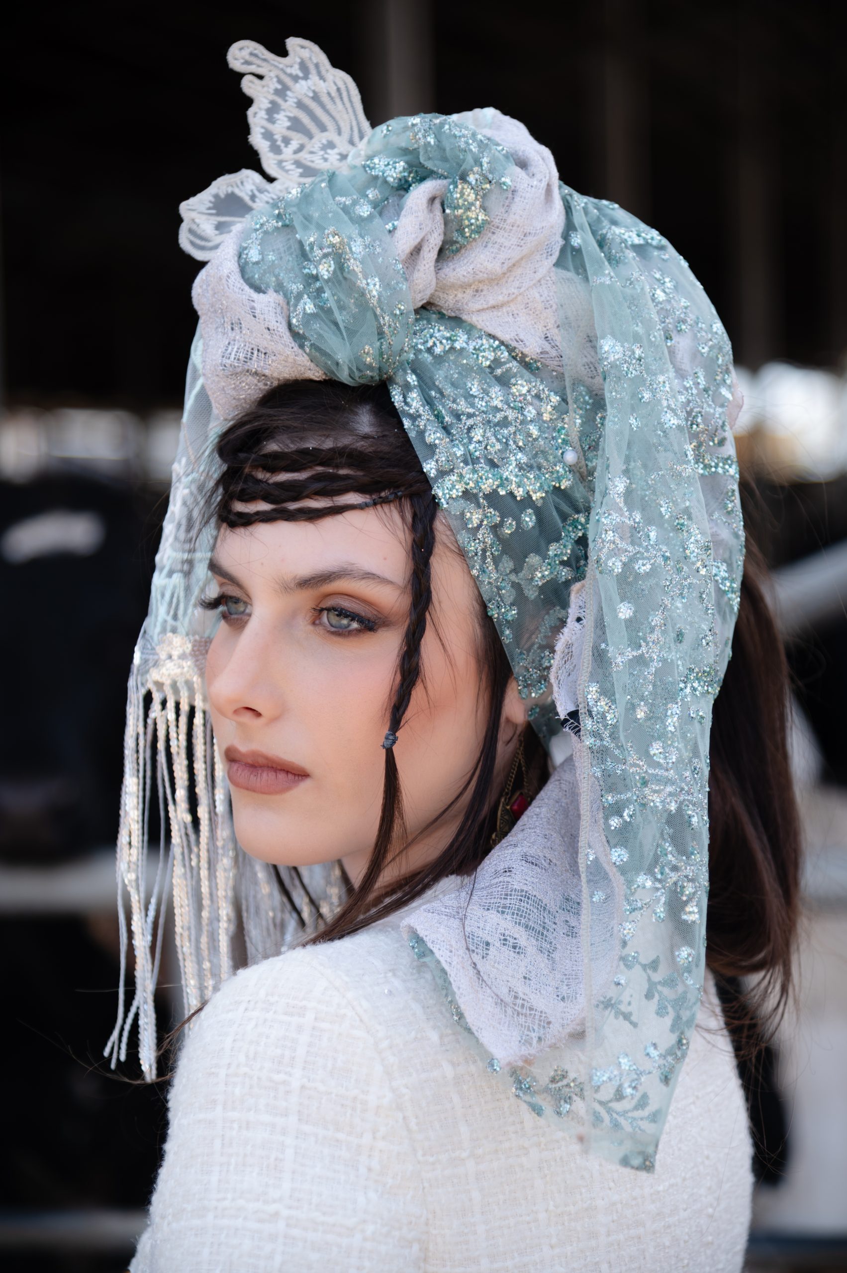 מורכבת מבד טול עם עיטורי נצנץ בצבע מנטה בשילוב בד אבן ארוג מנצנץ
