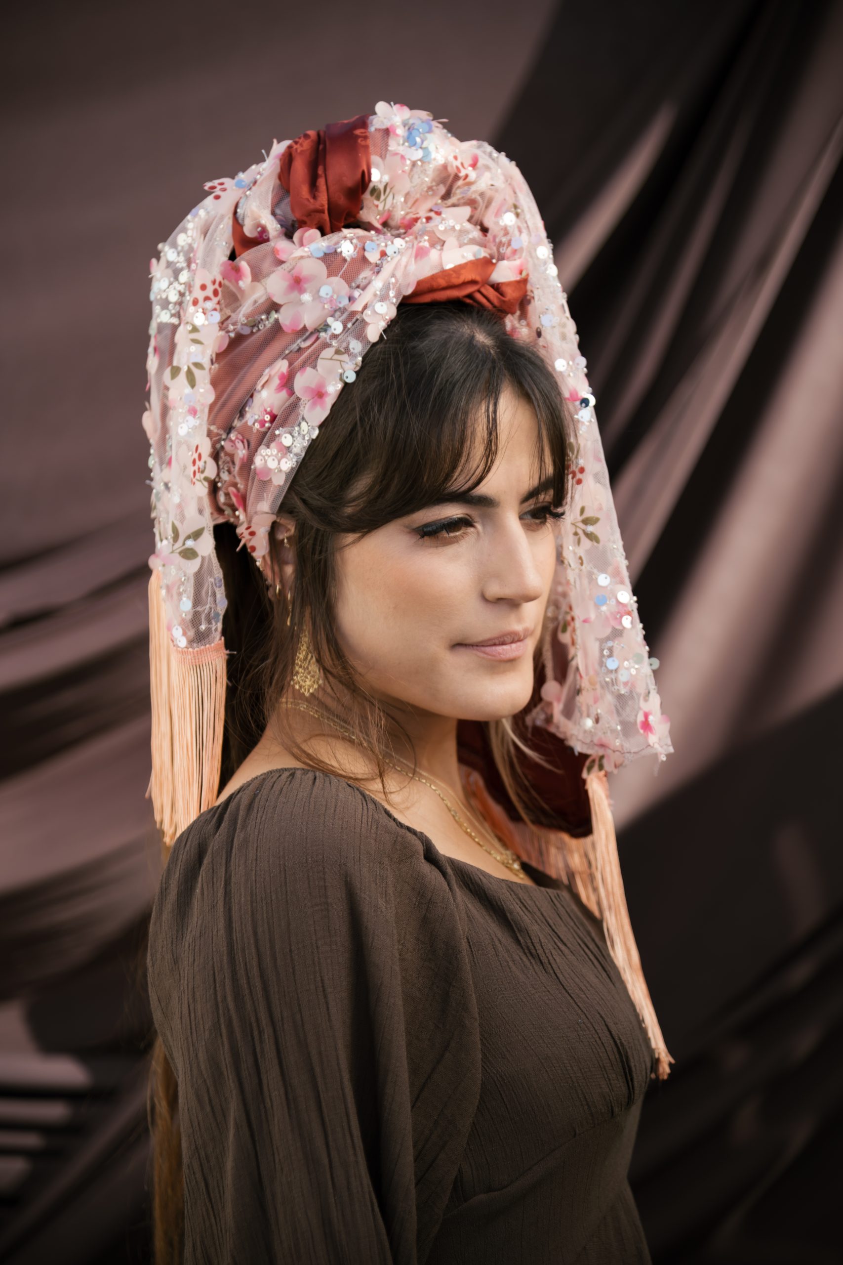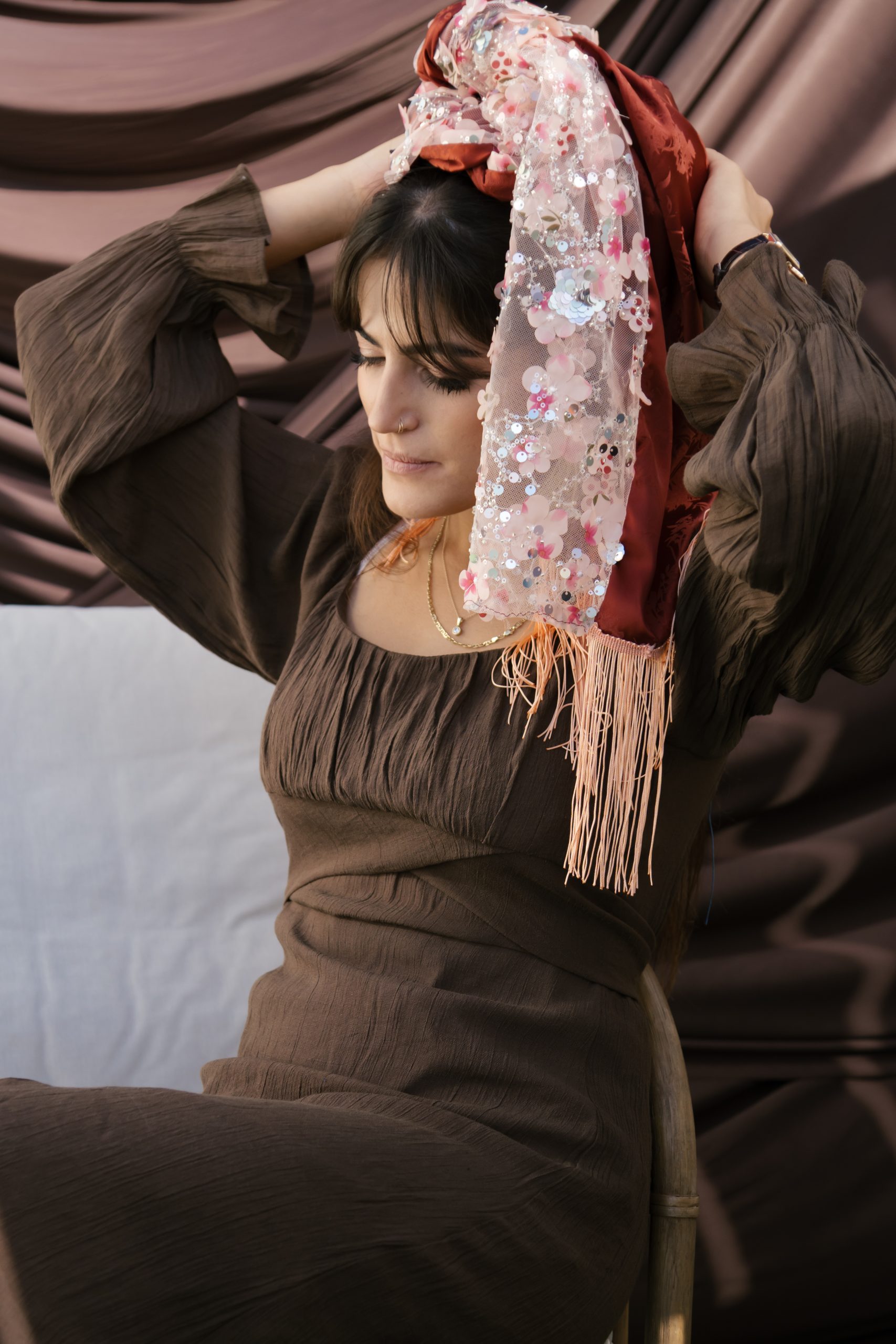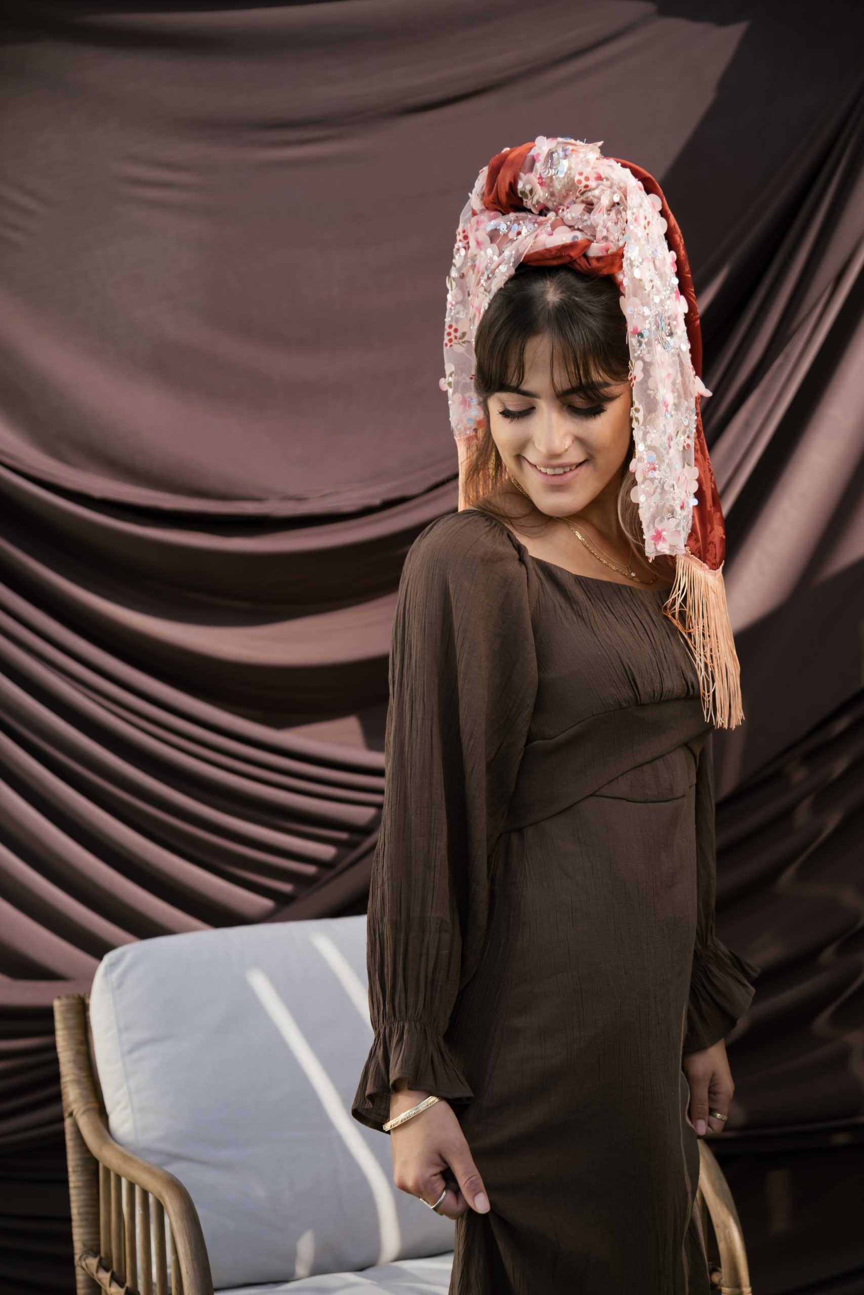 בד מיוחד בגווני ורוד כתמתם בשילוב חמרה.