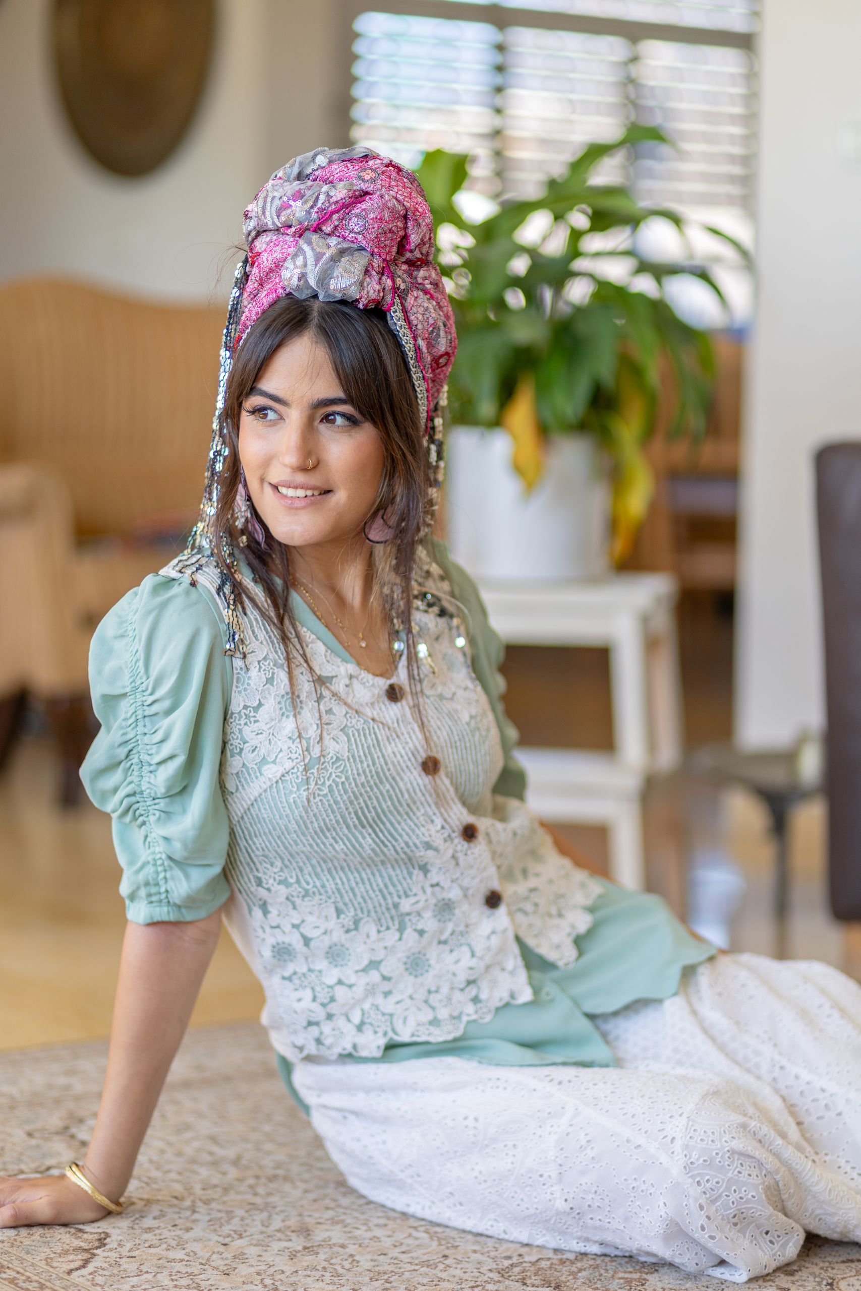 השילוב בין הפוקסיה החי לרקמה הכסופה יוצר מראה נשי, מרשים ומלא סטייל שמאיר את הפנים.