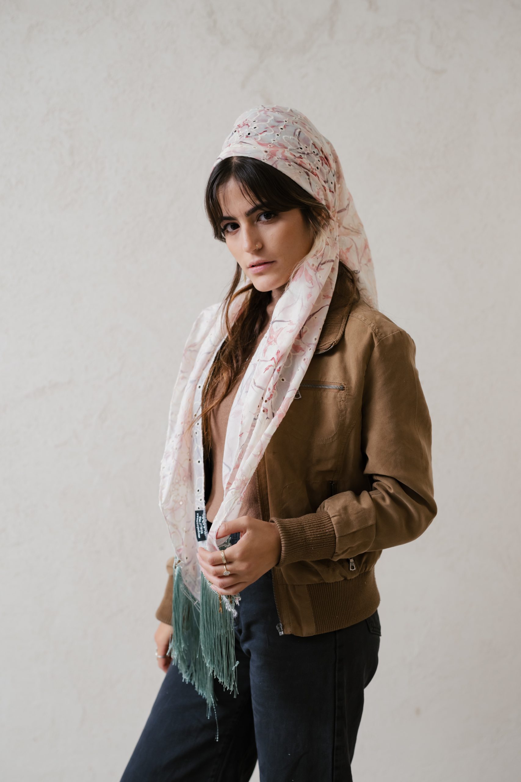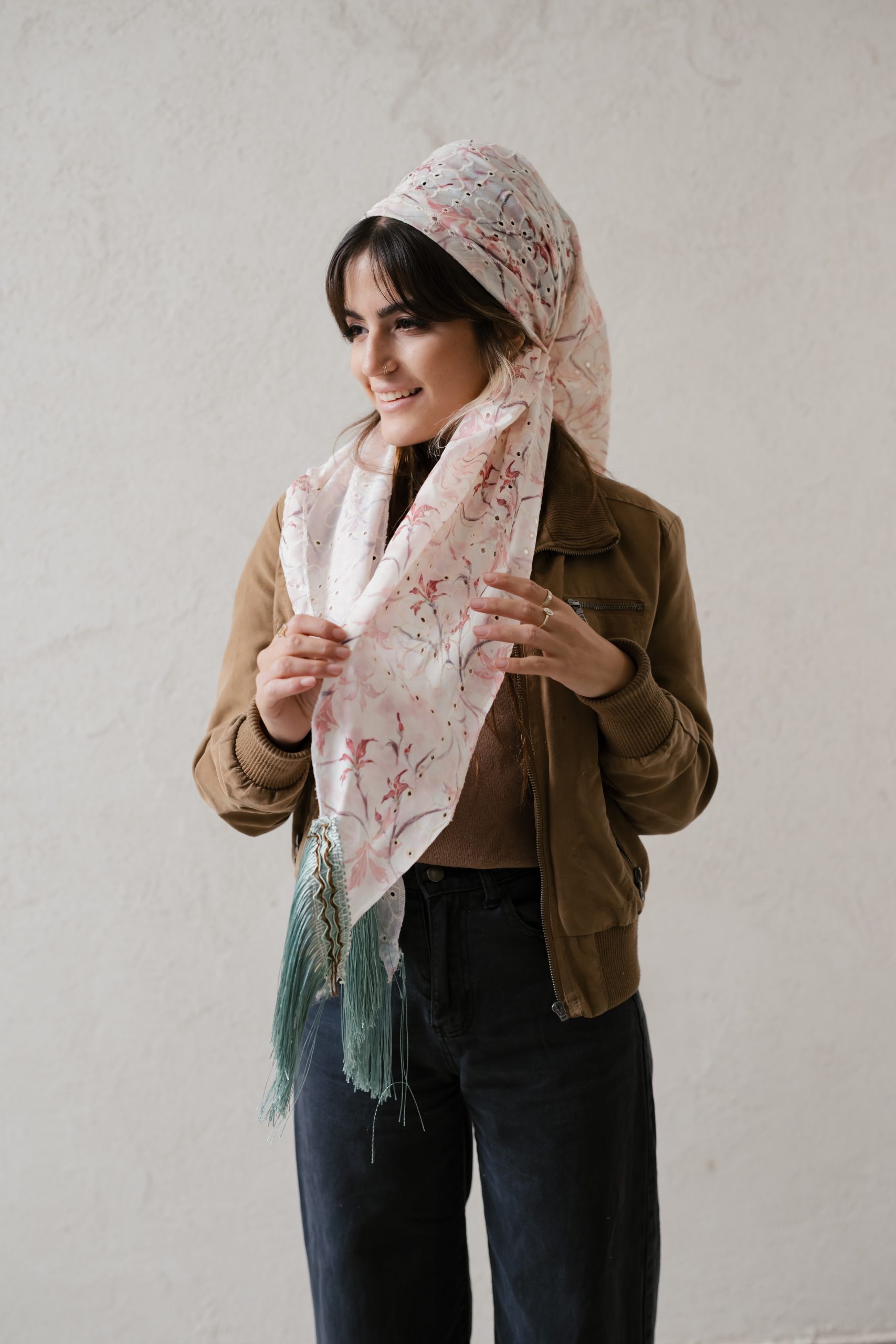 משולש ענק בריקמה עדינה על כותנה בהדפס גווני בורדו- ירוק על שמנת
