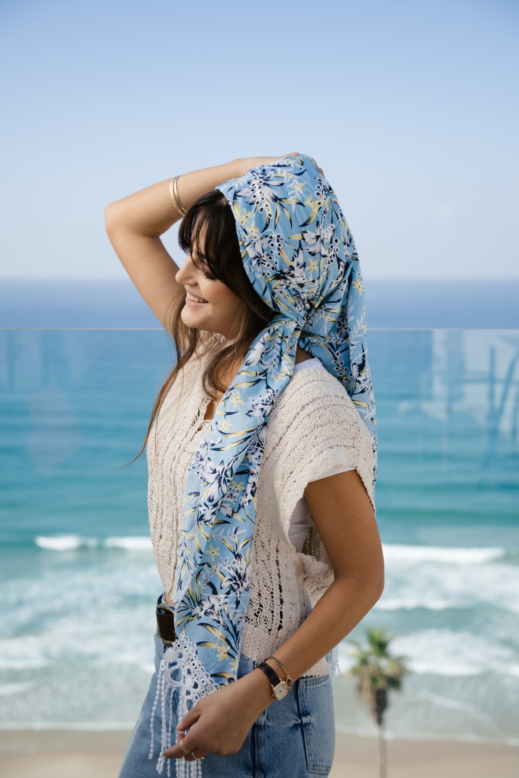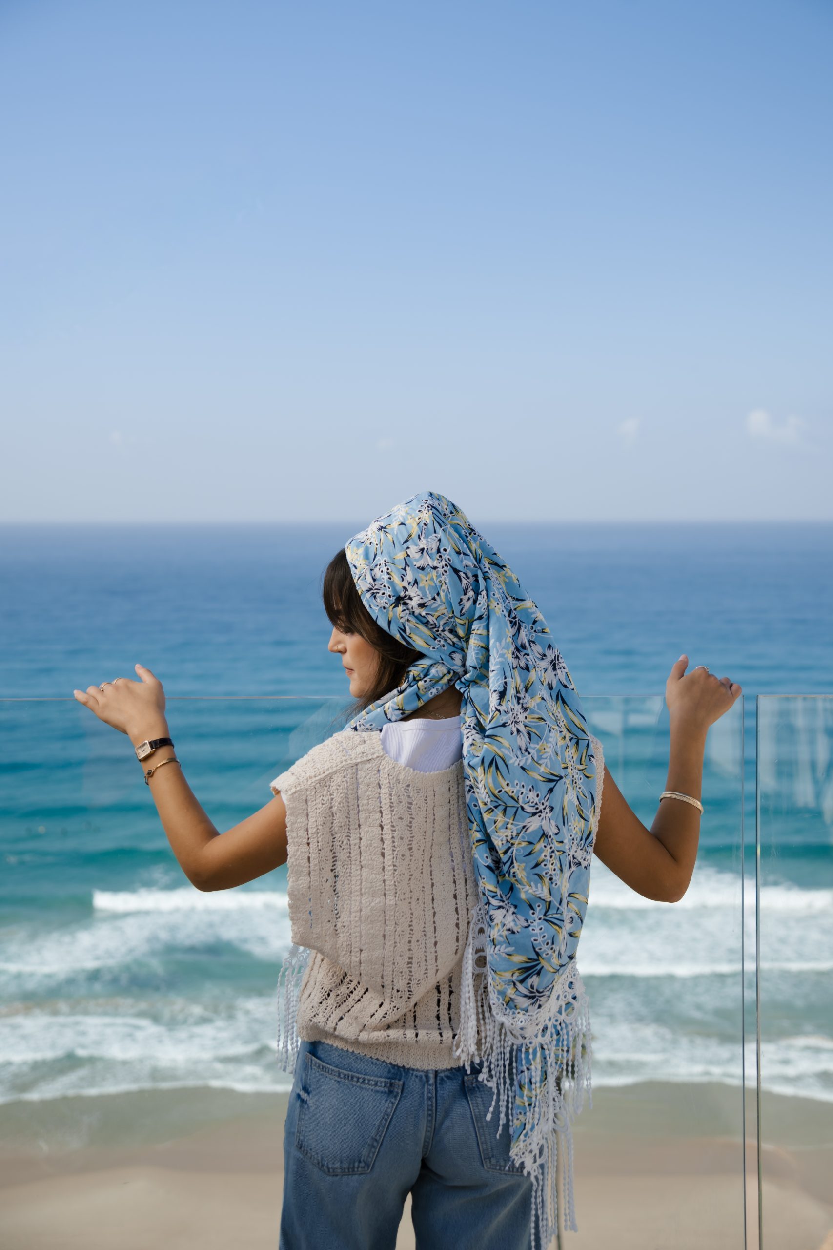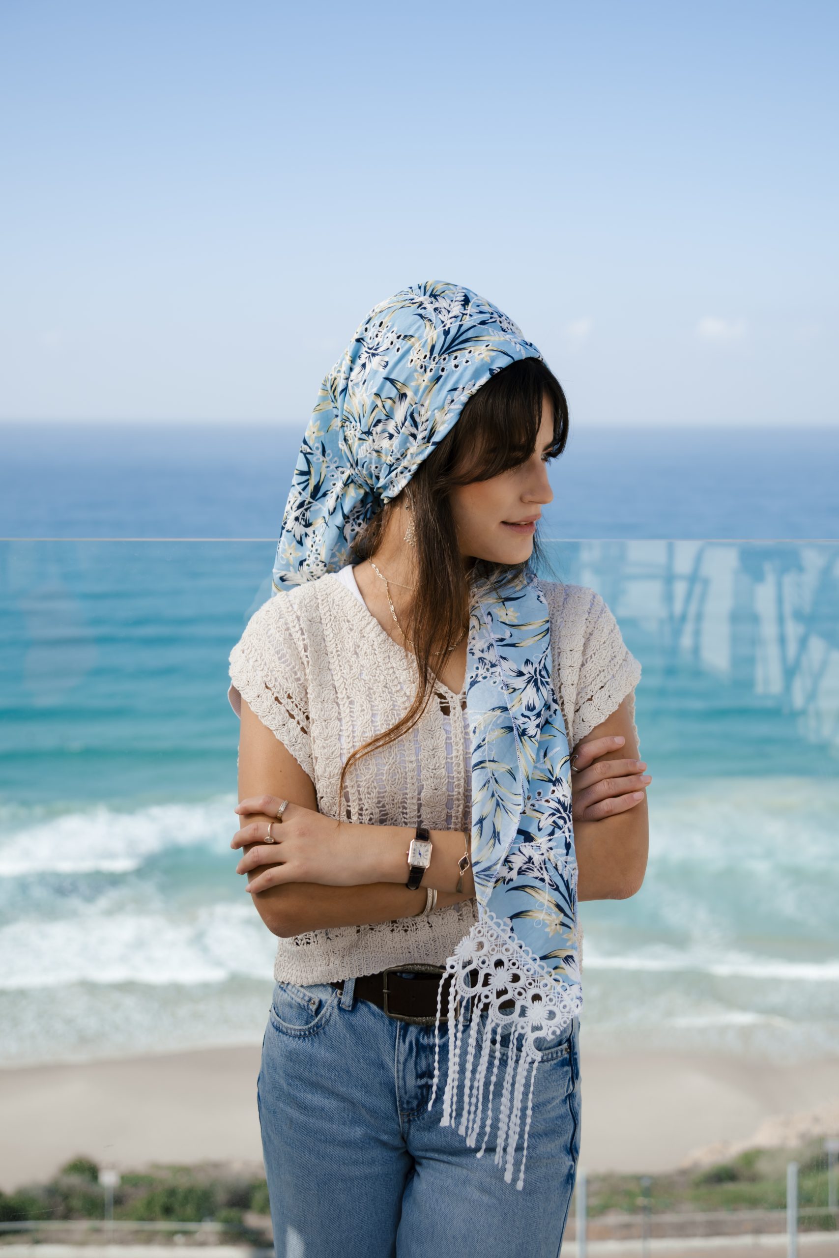 משולש ענק בריקמה עדינה על כותנה בהדפס תכלת בהדפס פרחוני לבן ונגיעות צהוב