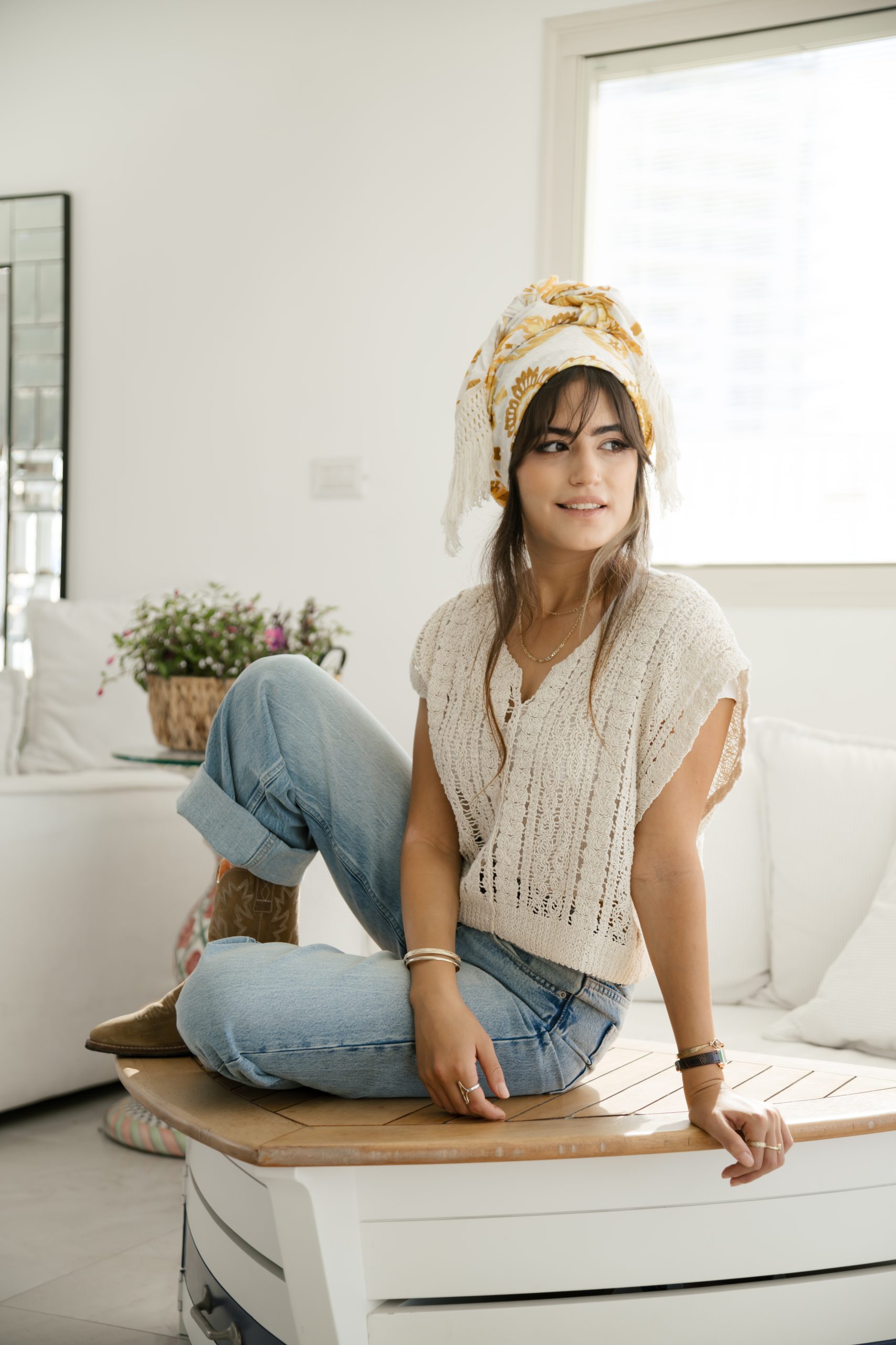משולש ענק בריקמה עדינה על כותנה בהדפס גווני חרדל- חום-שמנת